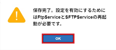 「保存完了。設定を有効にするためにはFtpServiceとSFTPServiceの再起動が必要です。」画面が表示されます。