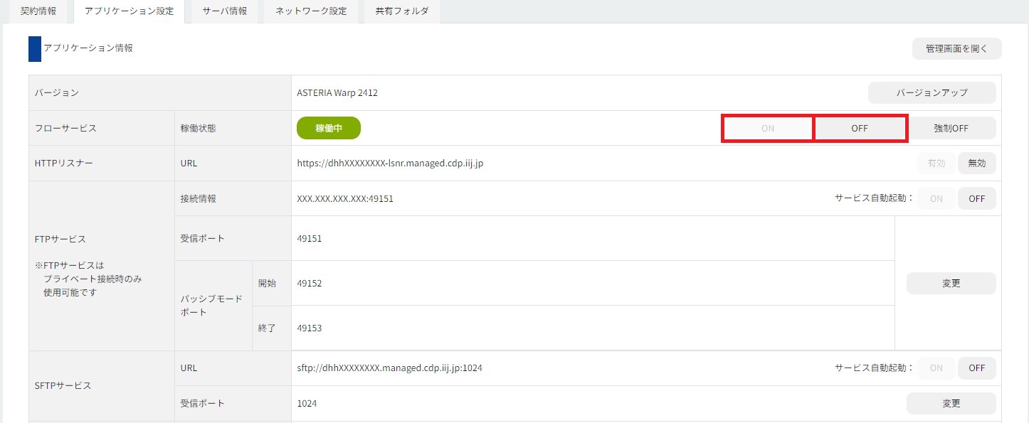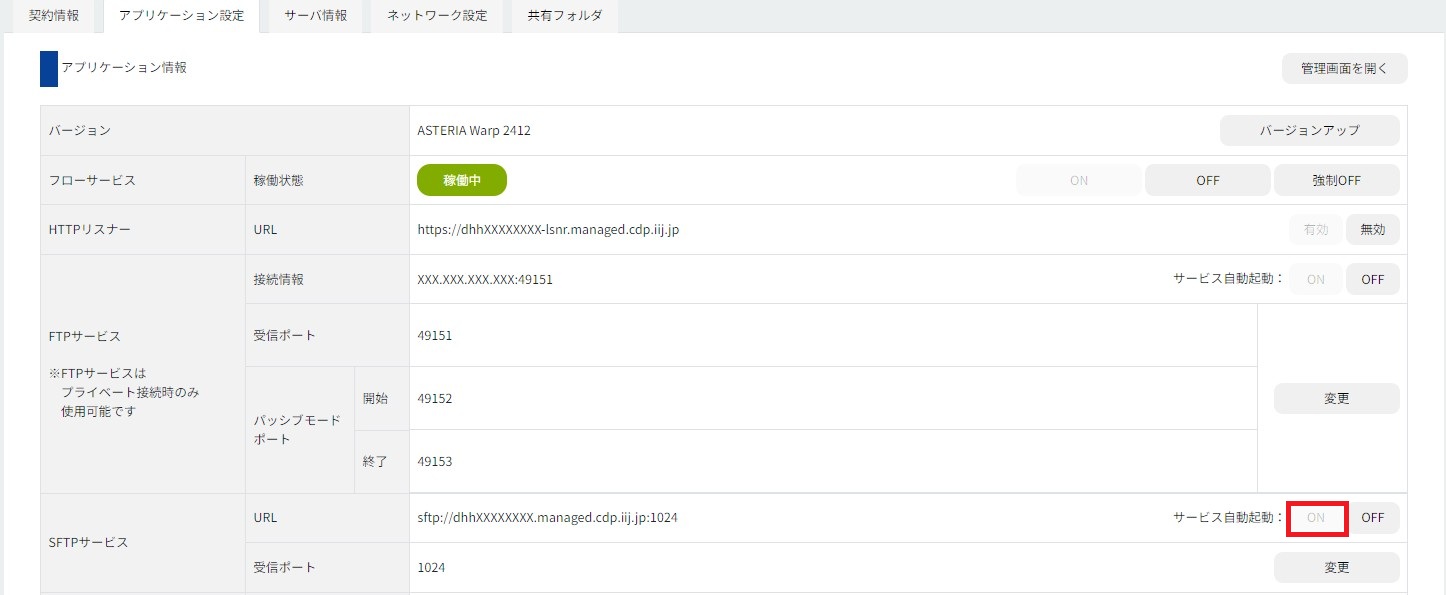 1.「コントロールパネル」にログインし、「クラウドデータハブ」メニュー、「アプリケーション設定」タブの順にクリックして表示される「アプリケーション情報」で、「SFTPサービス」の行にある「サービス自動起動」の「ON」をクリックします。