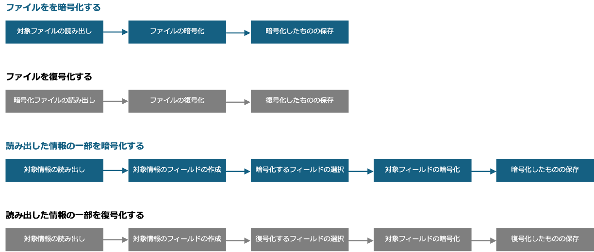 暗号化または復号化するファイルのエンコードがUTF-8のとき、エンコーディング設定を自動判定にすると、文字化けが発生します。ファイルを読み込むコンポーネントや、データベースからの読み出しのコンポーネントなどで、ファイルのエンコーディング設定をUTF-8に指定してください。