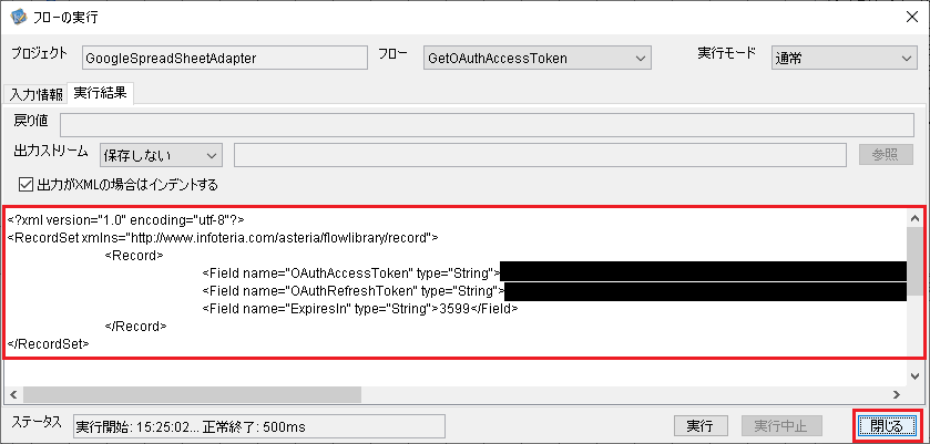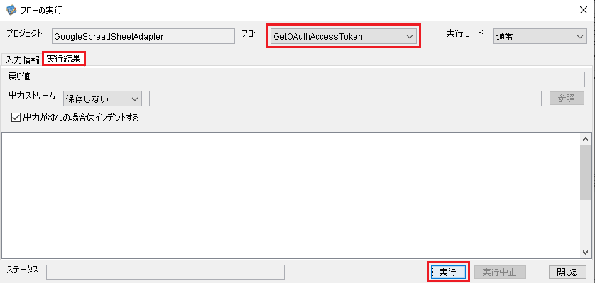 6.「フロー」が「GetOAuthAccessToken」であり、「実行結果」タブが選択されていることを確認したうえで、「実行」をクリックします。