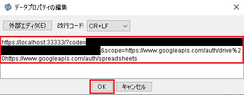 4.「11.認証レスポンスを取得する」で取得したURLを貼り付け、「OK」をクリックします。