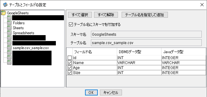 これを「テーブルとフィールドの設定」画面で表示させるには、PutSampleフローを使用します。利用方法について詳しくは、「GoogleSheetsPutコンポーネントのヘルプ」をご覧ください。