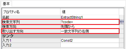 「ExtractString1」は、「?code=」から始まる文字列の右側の文字列を取り出すために、使用します。