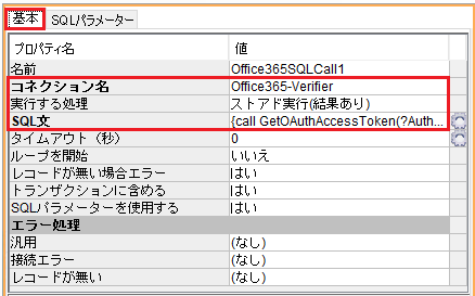 6.Office365SQLCall1を設定するために、フロー上の「Office365SQLCall1」をクリックし、「基本」タブで以下の項目を設定します。