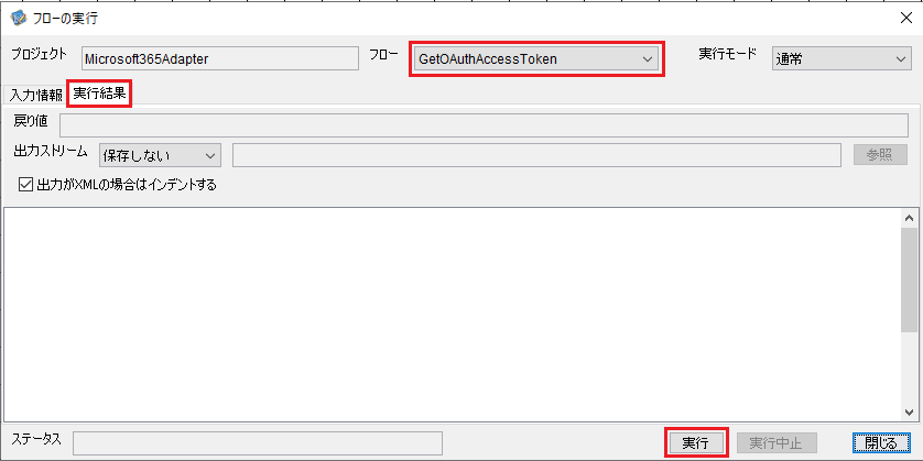 6.「フロー」が「GetOAuthAccessToken」であり、「実行結果」タブが選択されていることを確認したうえで、「実行」をクリックします。