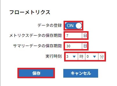 フロー管理コンソールのメトリクス設定と各情報の保存期間について