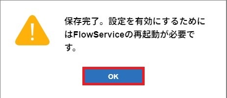 「保存完了。設定を有効にするためにはFlowServiceの再起動が必要です。」画面が表示されます。