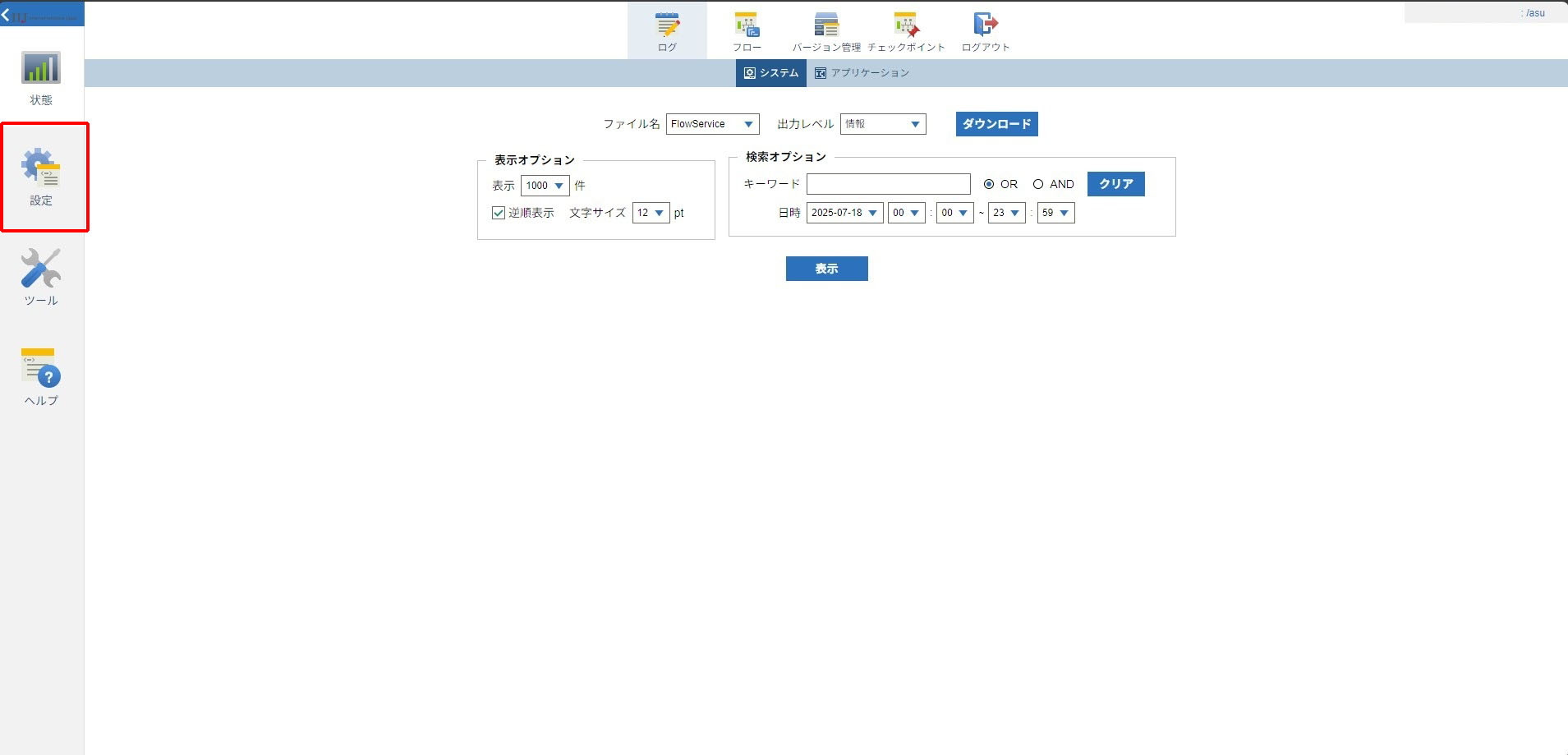 1.「フローサービス管理コンソール」に、asuユーザまたは管理者権限を持つユーザでログインします。
