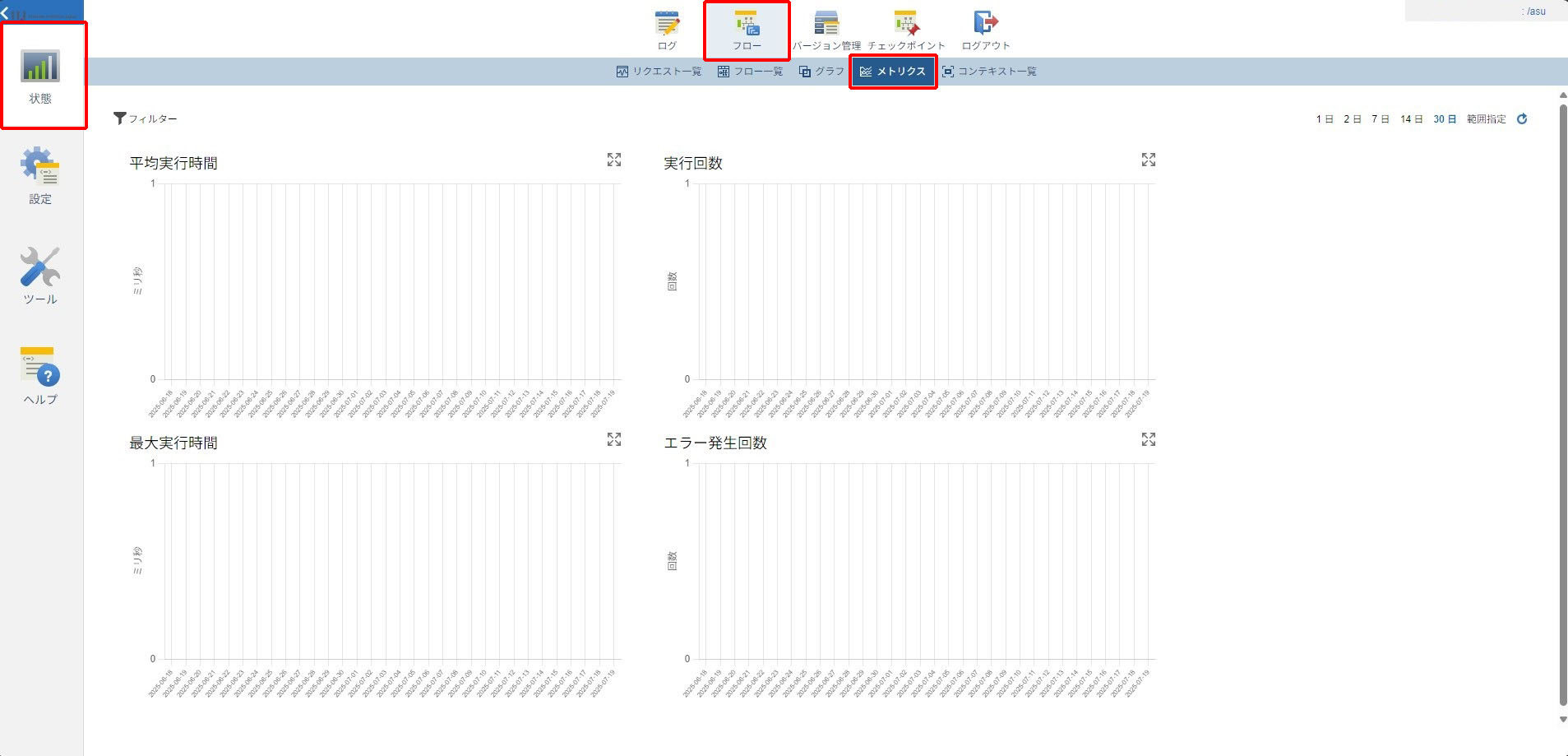 7.「フローサービス管理コンソール」で、「状態」、「フロー」、「メトリクス」の順にクリックし、グラフを確認します。