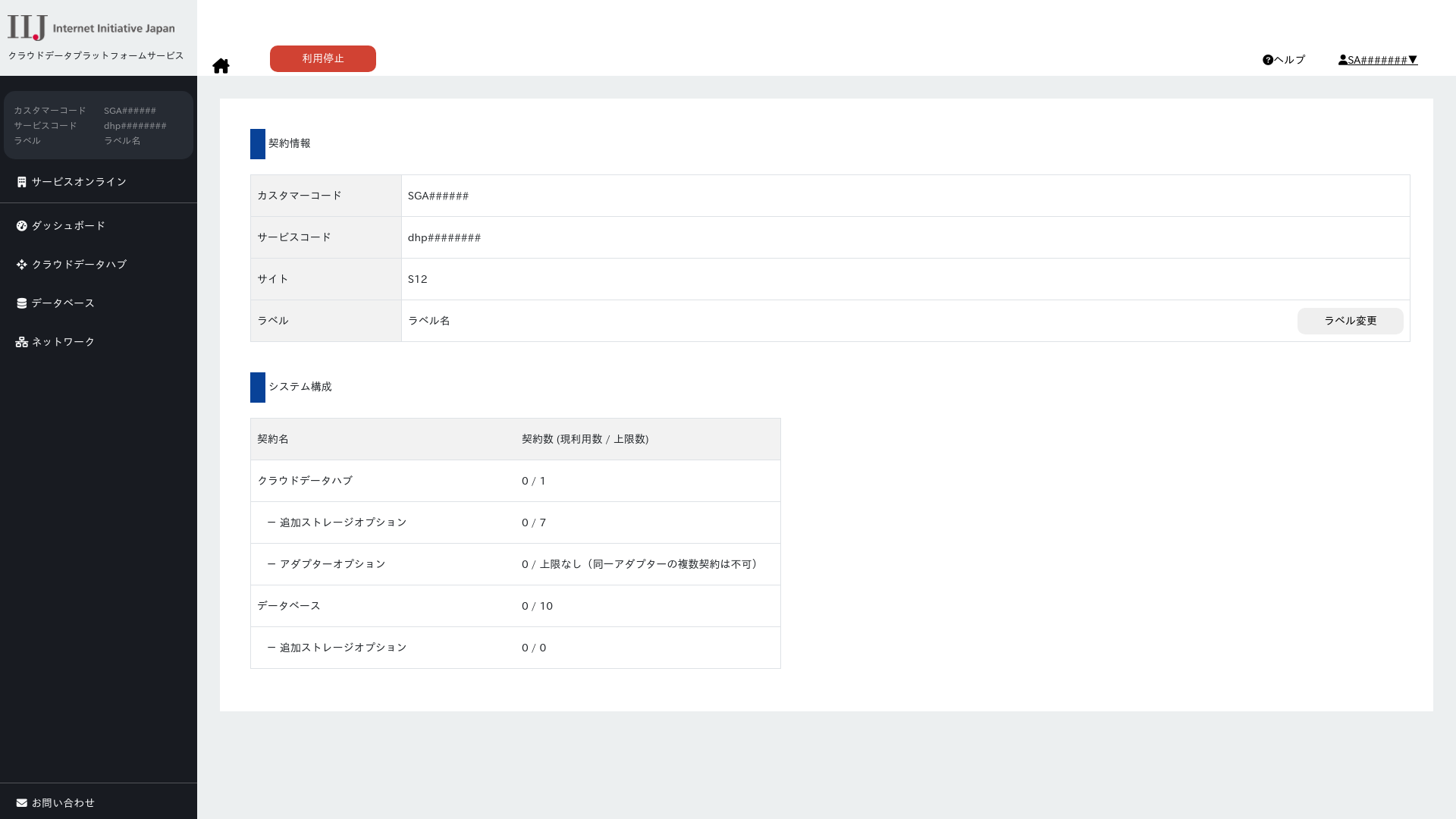 | クラウドデータハブ | クラウドデータハブの契約数が表示されます。本サービスのご契約ごとに、1個契約されます |