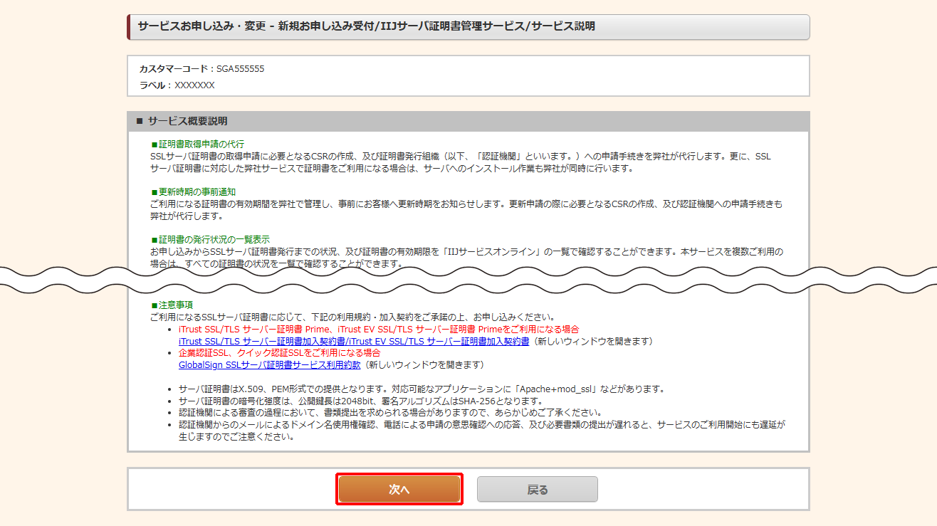 1.「新規お申し込み」の「IIJサーバ証明書管理サービス」を選択し、「次へ」ボタンをクリックします。