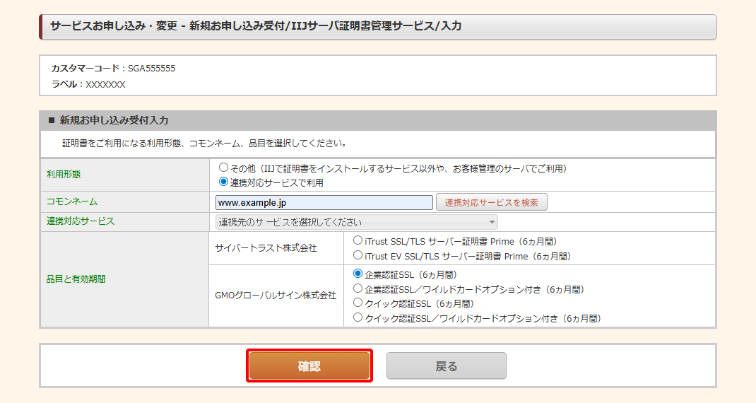 | 連携対応サービス | 「利用形態」で「連携対応サービスで利用」を選択し、「コモンネーム」で「連携対応サービスを検索」ボタンをクリックすると表示される項目です。プルダウンメニューから、連携するサービスのご契約を選択します
