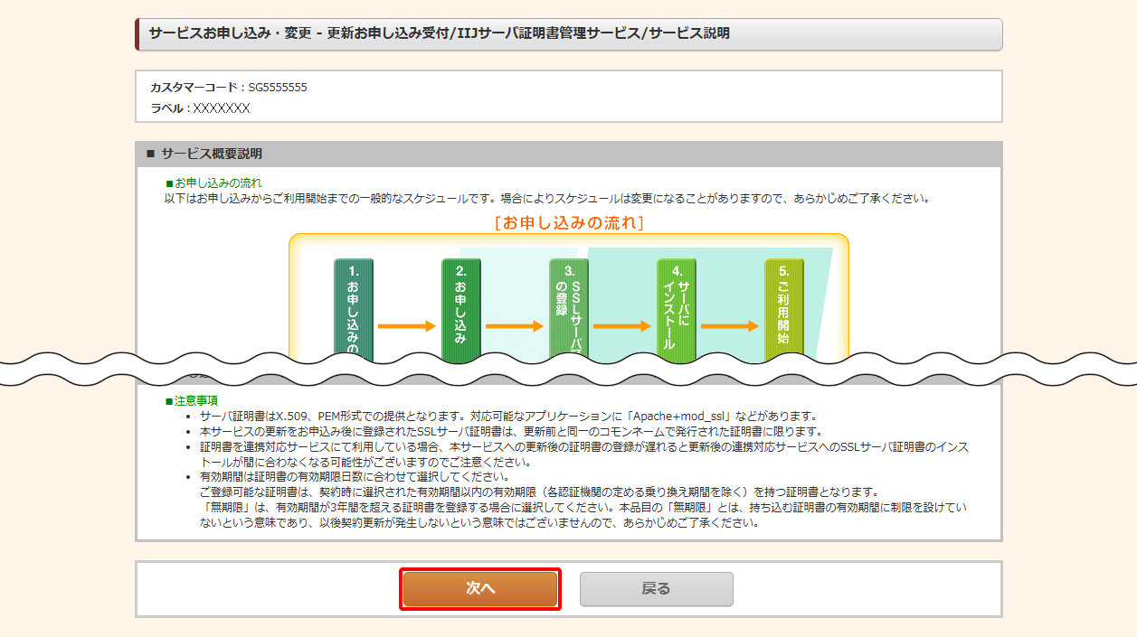 また、本サービスで利用するサーバ証明書の更新は、お客様が発行元の認証機関へお申し込みください。認証機関から発行された更新後のサーバ証明書及び秘密鍵(パスフレーズ設定無)、中間CA証明書(任意)は、本サービスの契約更新のお申し込み後、所定の期限までに「IIJサービスオンライン(https://help.iij.ad.jp/)」から登録していただきます