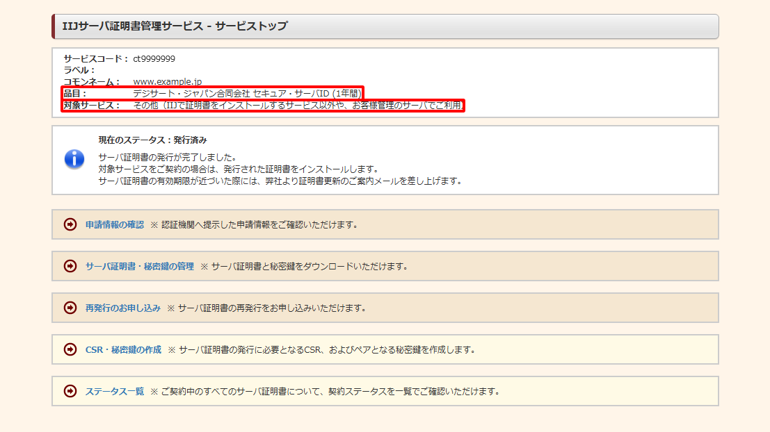トップページ > 設定と管理 > サービスの設定と管理 > IIJサーバ証明書管理サービス > サービストップの順に画面遷移する