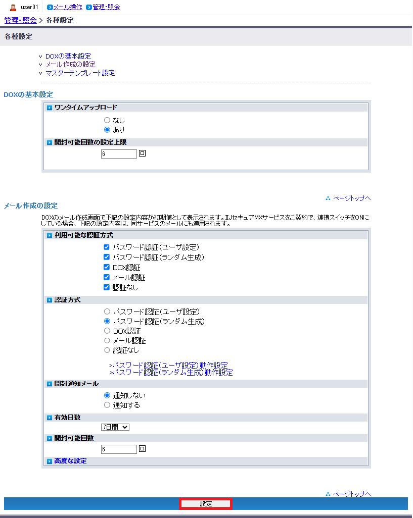 ここでは、DOXのメール機能全体の設定を変更することができます。