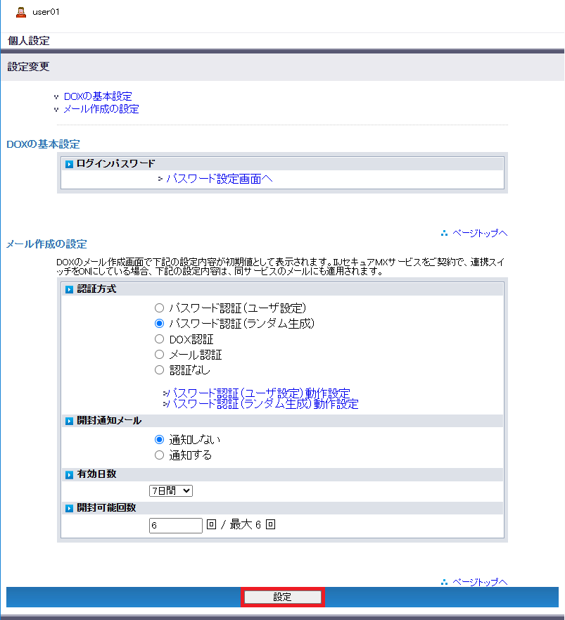 項目を設定したら、「設定」をクリックします。設定項目について詳しくは、下記リンクより詳細ページを参照してください。