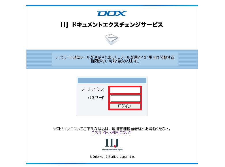 送信されてきたパスワード通知メールに記載されているパスワードを入力します。