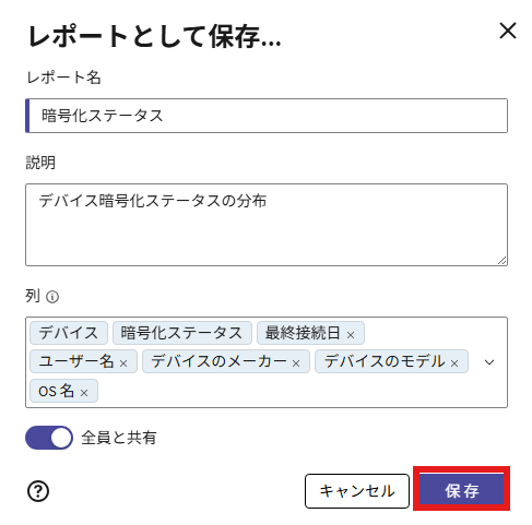 | 全員と共有 | スライドを「オン」にすると、すべてのユーザーとレポートを共有できます |