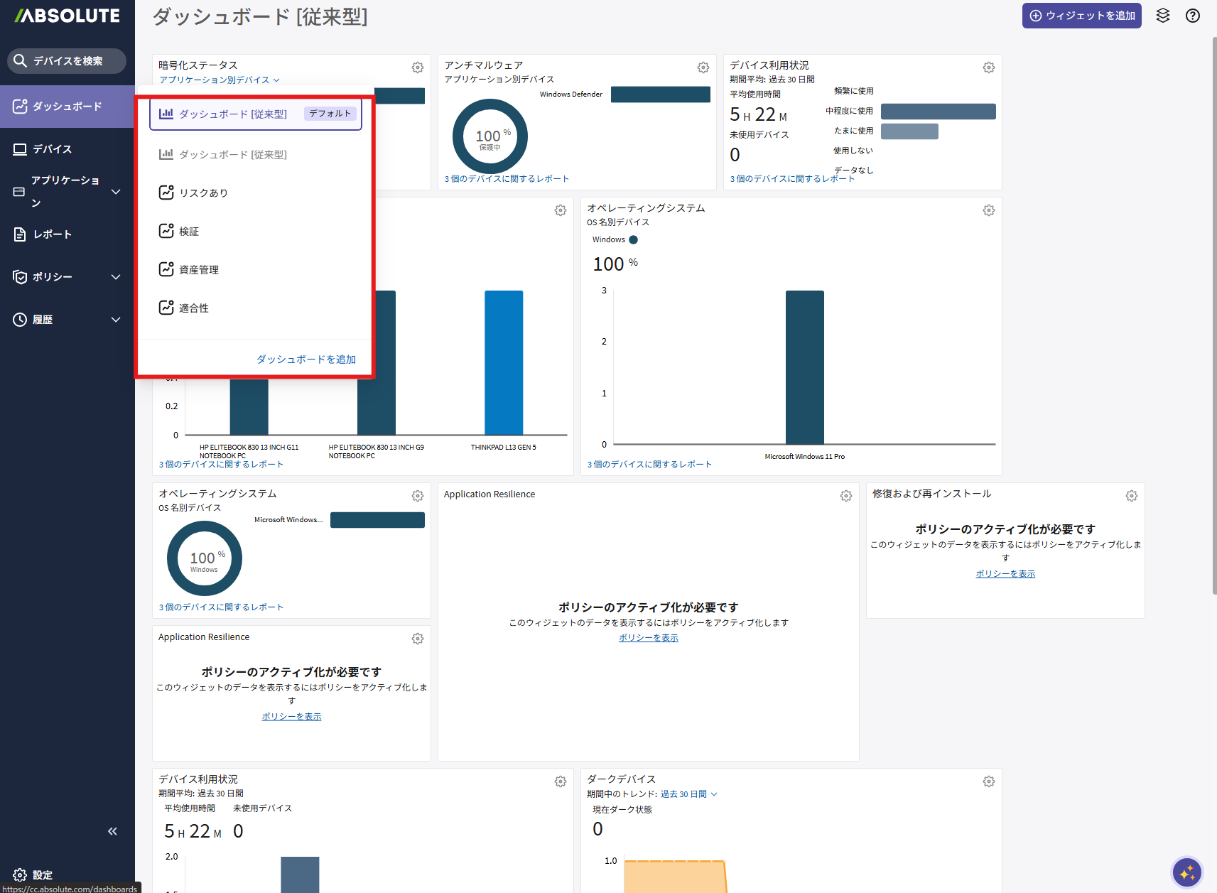 2.「ダッシュボード」メニューにカーソルを合わせ、任意の「ダッシュボード[カスタム]」をクリックします。