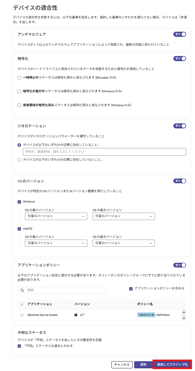 アクティブ化すると、必要なアプリケーションポリシーまたは、Application Resilienceポリシーで定義された要件に沿っているかを確認し、デバイスが適合か非適合か判定します 【注意】事前に「必要なアプリケーション」ポリシー、または「Application Resilience」ポリシーをアクティブ化する必要があります |
