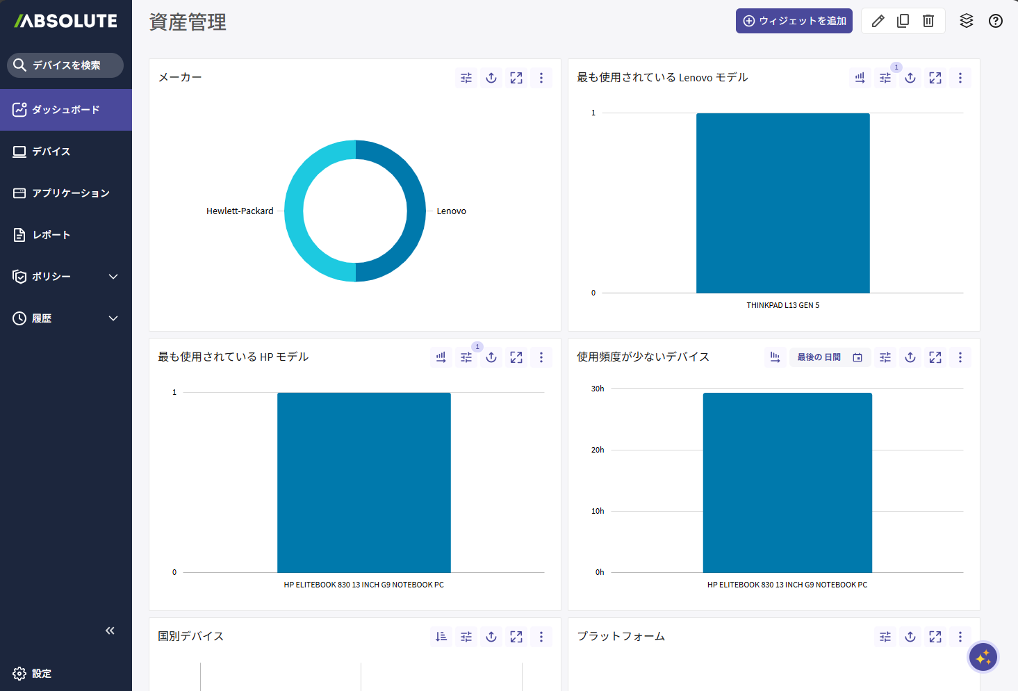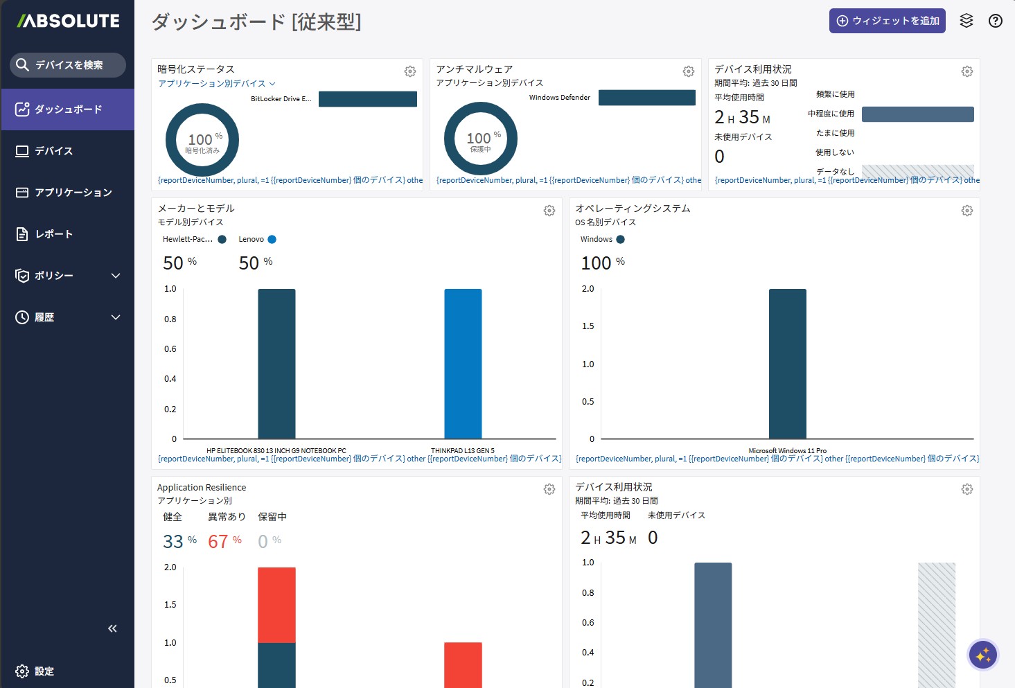 ウィジェットはダッシュボードの基本となる構成要素です。デバイスの暗号化ステータス、利用状況など、特定の情報を示すウィジェットをダッシュボードに追加できます。
