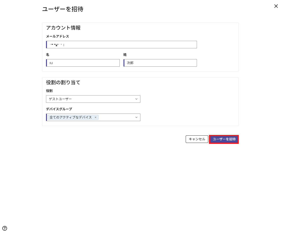 3.以下の項目を設定し、「ユーザーを招待」をクリックします。