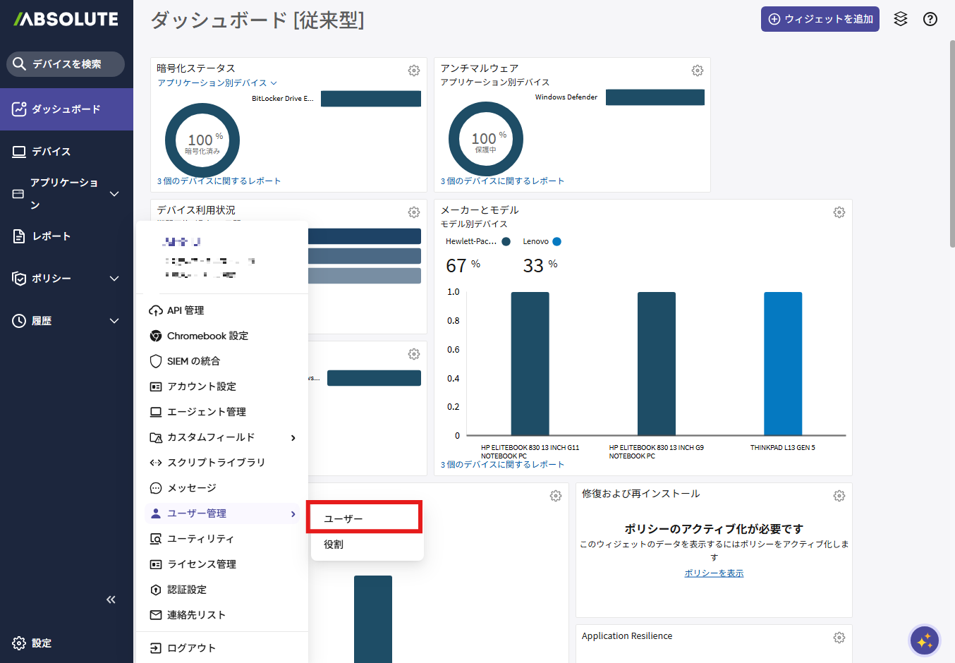 1.「設定」メニューをクリックし、表示されるメニューから「ユーザー管理」、「ユーザー」の順にクリックします。