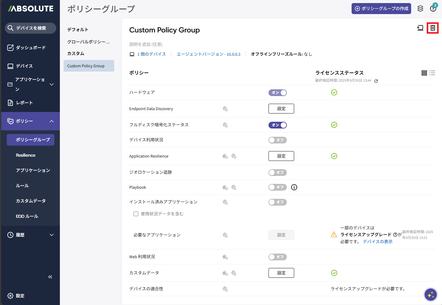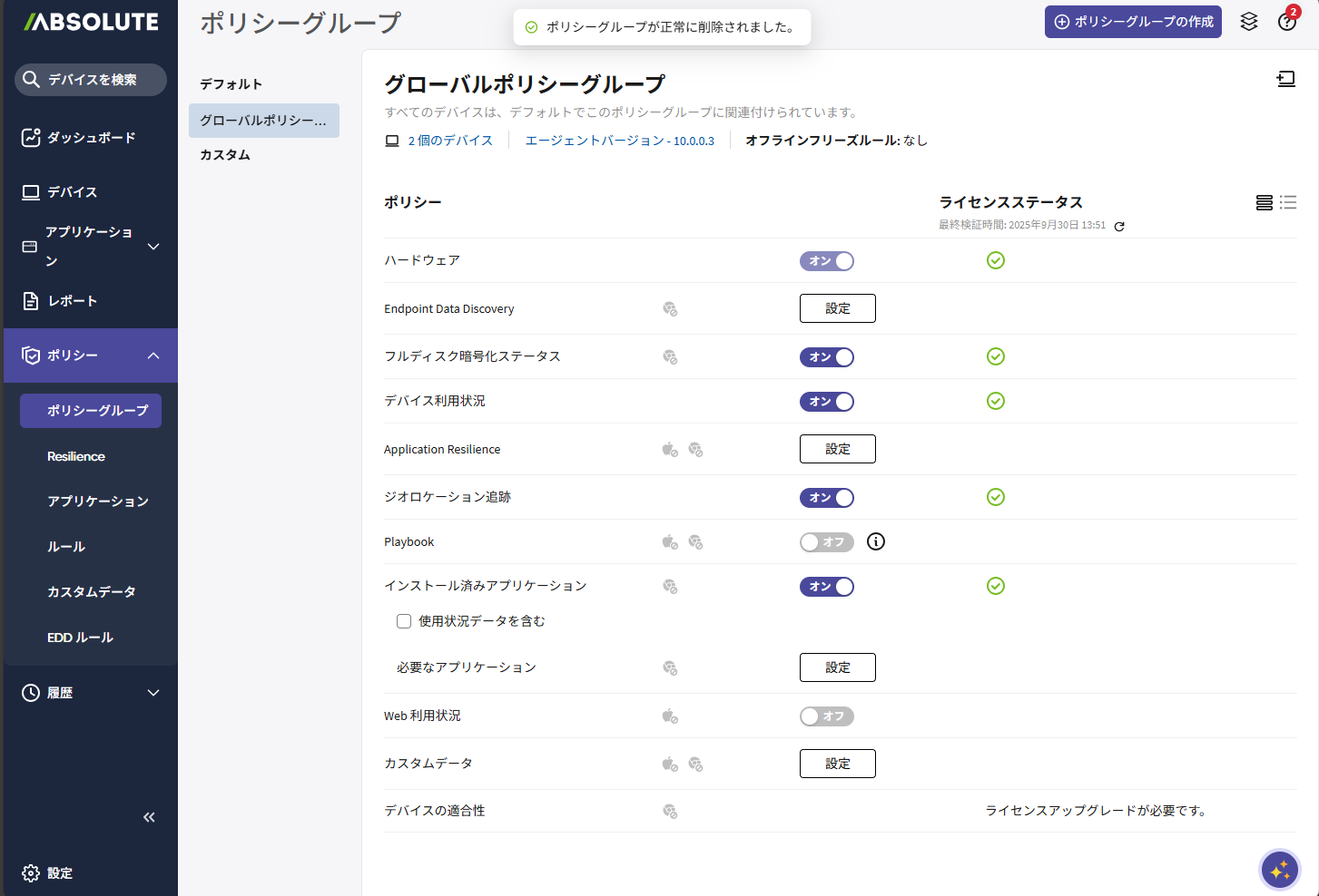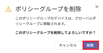 ポリシーグループを削除します。削除したポリシーグループに割り当てられていたデバイスは、自動で「Global Policy Group」に移動します。