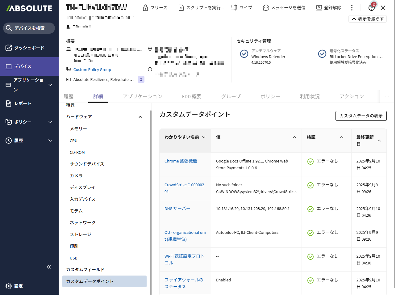 デバイスからカスタムデータポイント情報を取得するには、「カスタムデータ」ポリシーがアクティブ化されている必要があります。ポリシーをアクティブ化する方法について詳しくは、「ポリシーをアクティブ化または非アクティブ化する」をご覧ください。