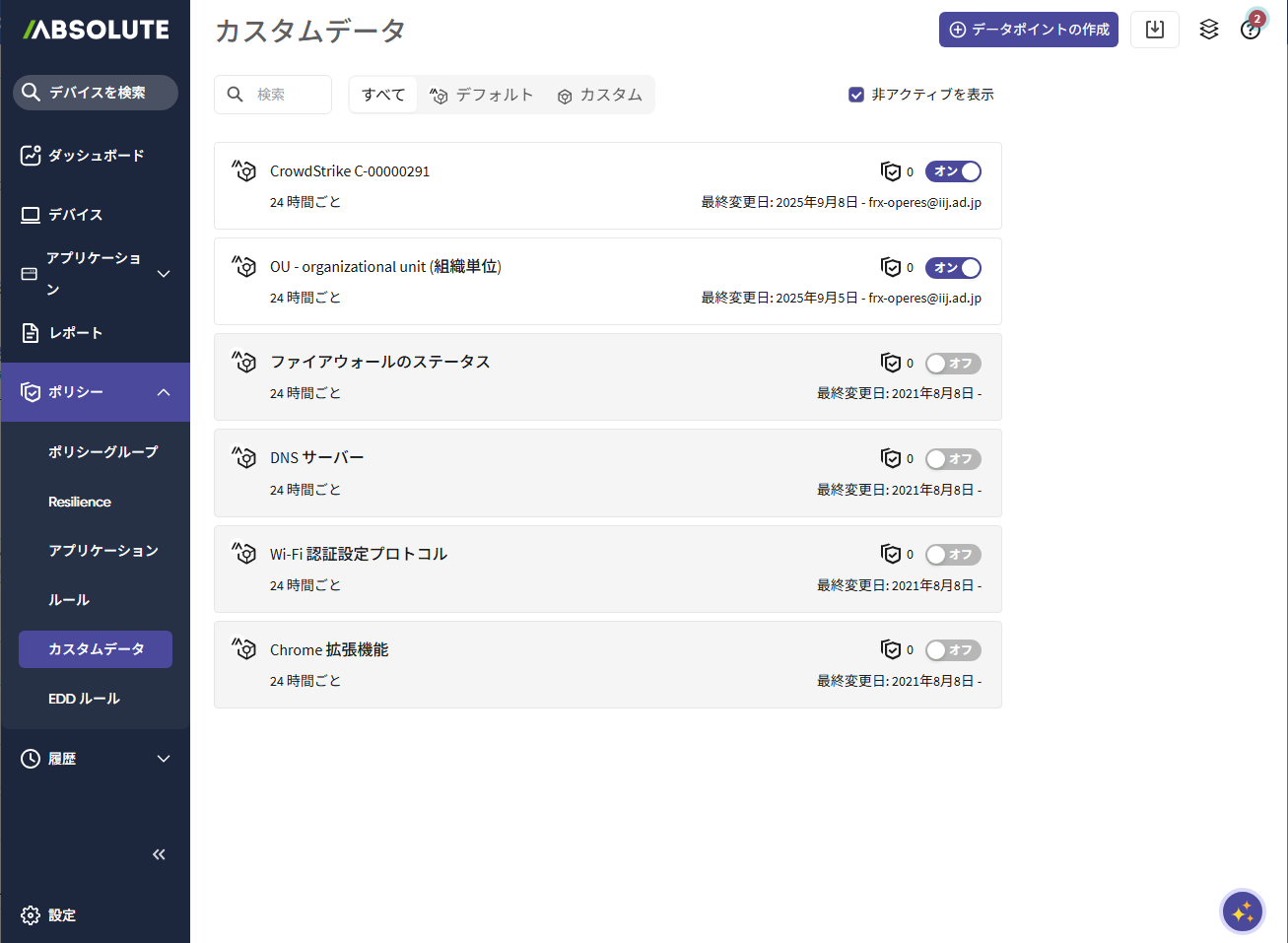 メニュー:カスタムデータ 概要 カスタムデータポイントを管理するメニューです。「カスタムデータ」ポリシーをアクティブ化したデバイスから取得する、データポイントの作成とアクティブ化ができます。 詳しくは、以下をご覧ください。 カスタムデータポイントを設定する カスタムデータポイントを編集する