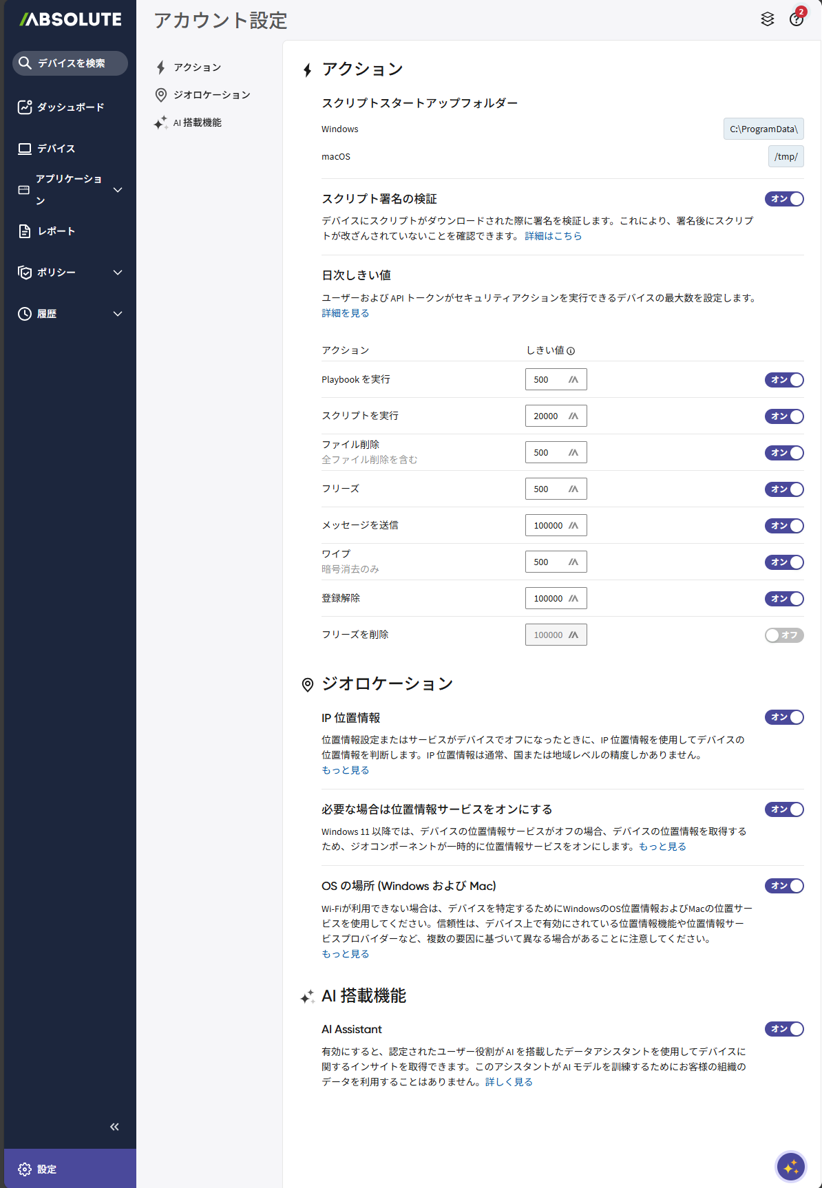 「スクリプトスタートアップフォルダー」及び「スクリプト署名の検証」はStandardグレードをご契約中の場合のみ、利用できます。Basicグレードをご契約中の場合、これらの項目は表示されません。
