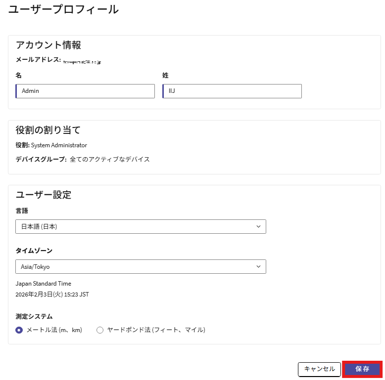 | 姓 | ユーザの姓(例:IIJ)を入力します |