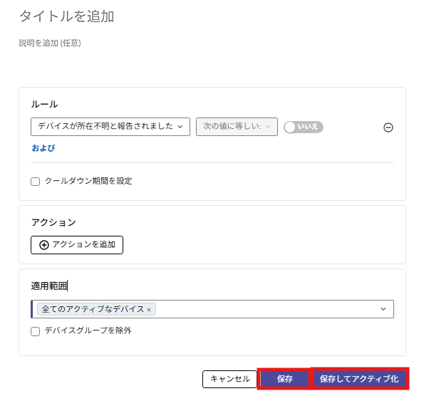 デバイスの位置情報、暗号化ステータスなど、デバイスの状態が変更された場合に、以下のアクションを実行するルールを作成します。