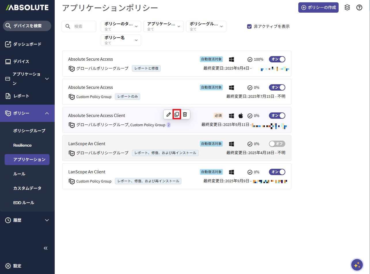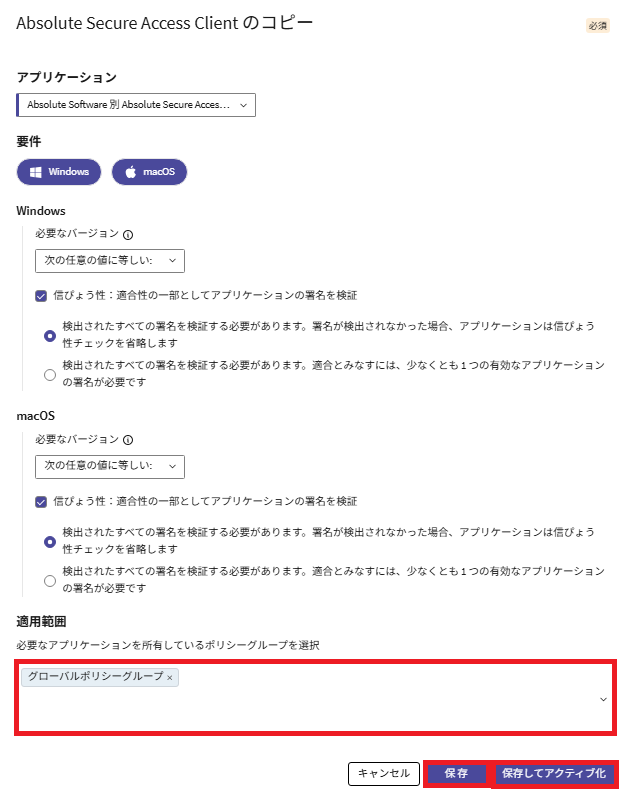 「アプリケーションポリシー」画面が表示されます。