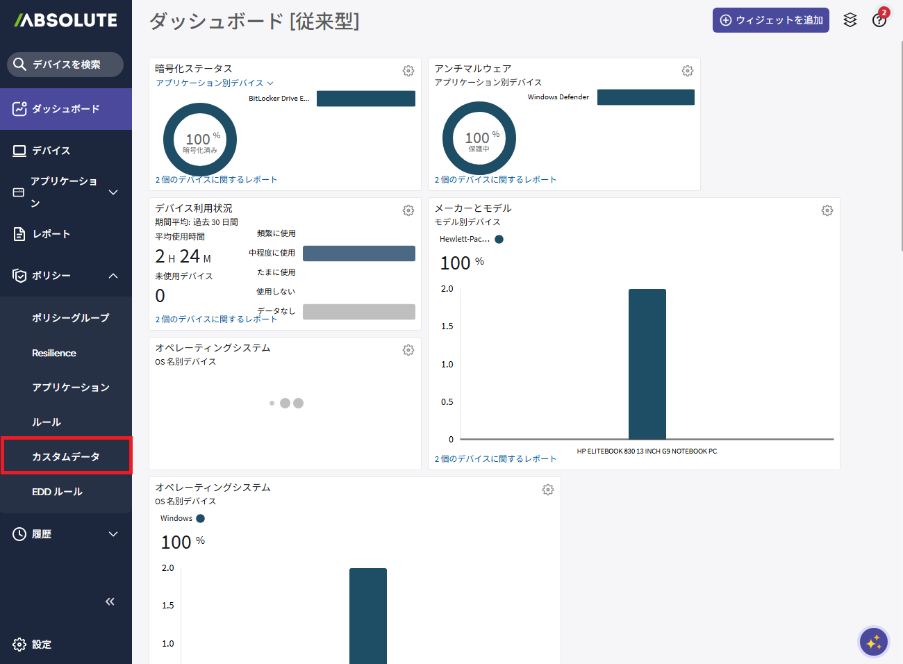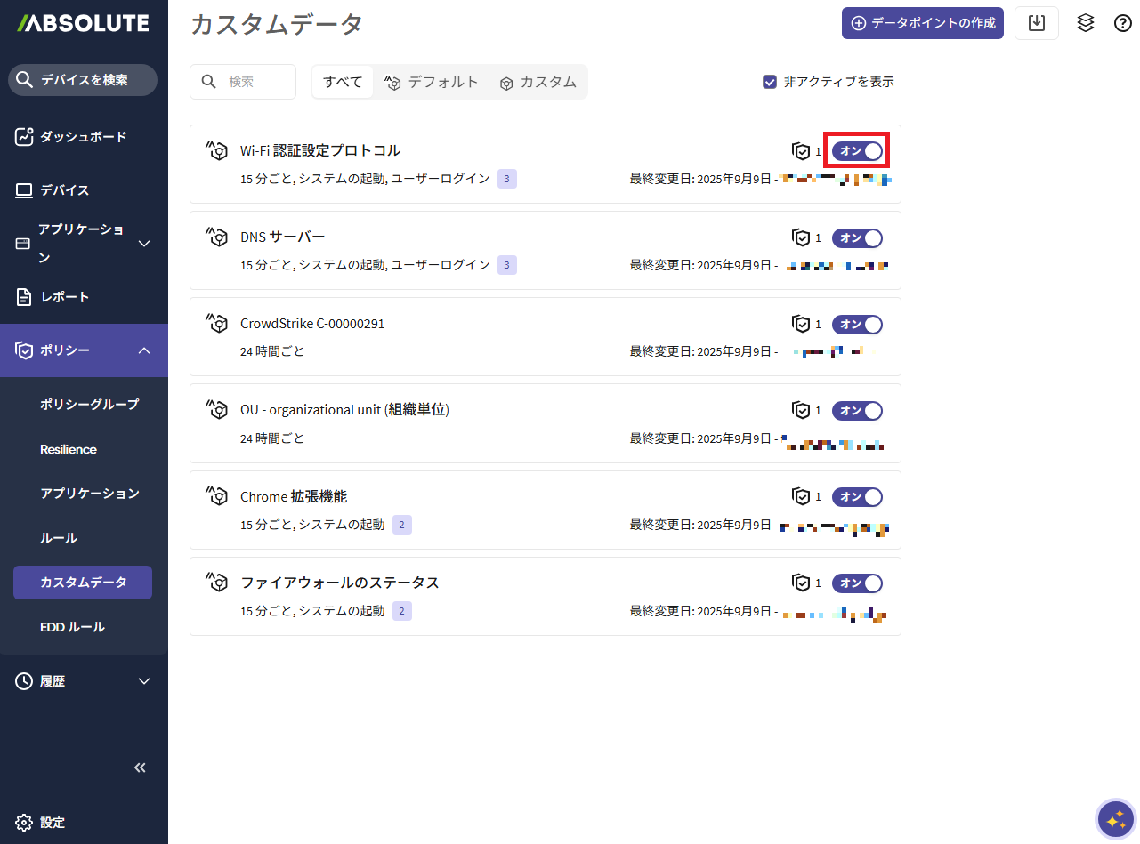 カスタムデータポイントをアクティブ化する カスタムデータポイントをアクティブ化します。 1.「ポリシー」メニューをクリックし、表示される項目から「カスタムデータ」をクリックします。 「カスタムデータ」画面が表示されます。 2.アクティブ化するカスタムデータポイントのスライドを「オン」にします。 以上で、カスタムデータポイントのアクティブ化は完了です。