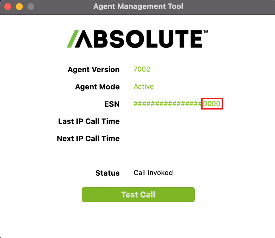 5.「Test Call」をクリックし、ESNの下4桁が「0000」であることを確認します。
