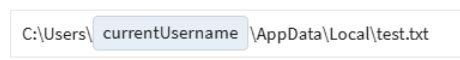 - 例えば5台のデバイスからファイルを削除する必要があり、ファイルはC:\Users\<Username>\AppData\Localフォルダに保存されているとします。C:\Users\まで入力後、「変数を挿入」をクリックし、変数リストから「currentUsername」を選択し、ファイルパスの残りの部分を入力すると<Username>の部分を補完できます