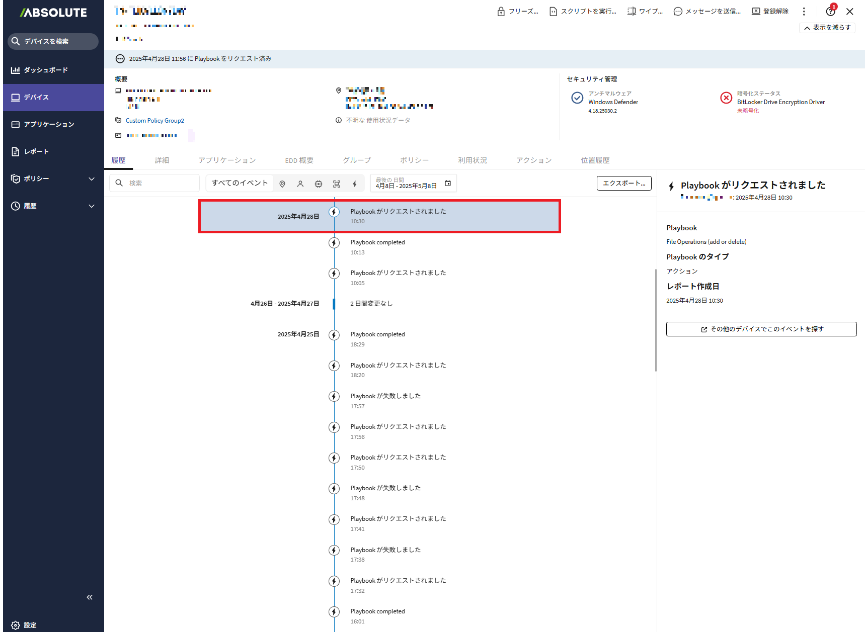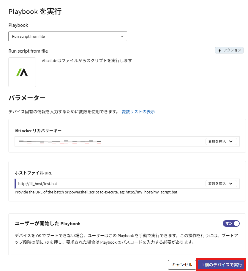 - このPlaybookは、Bitlocker以外の暗号化製品によって暗号化されたデバイスでは実行できません。