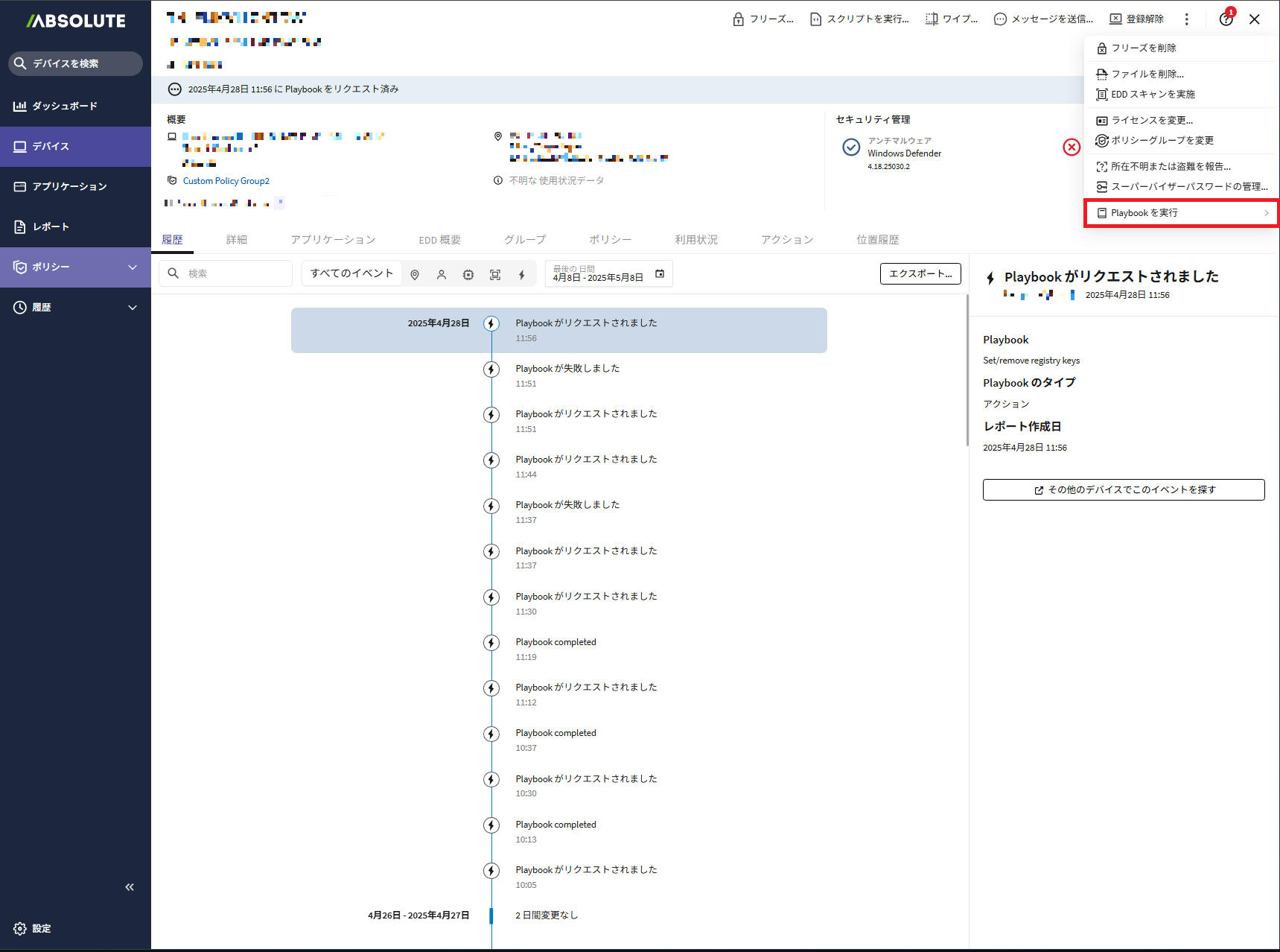 6.「履歴」タブをクリックし、「Playbookがリクエストされました」が表示されることを確認します。