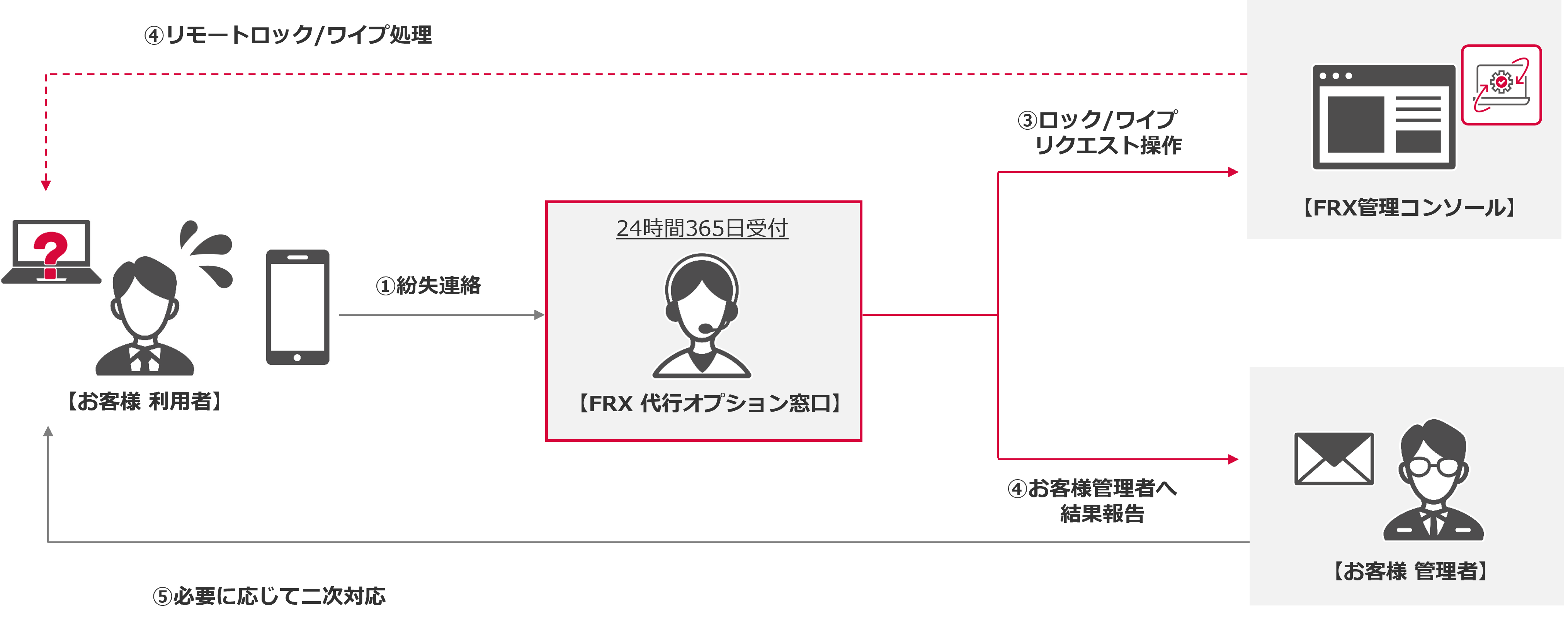 本サービスで管理するデバイスが紛失または盗難された際に、利用者からの依頼に基づいて、リモートロックまたはリモートワイプの操作を代行する、24時間365日対応の専用窓口を提供します。