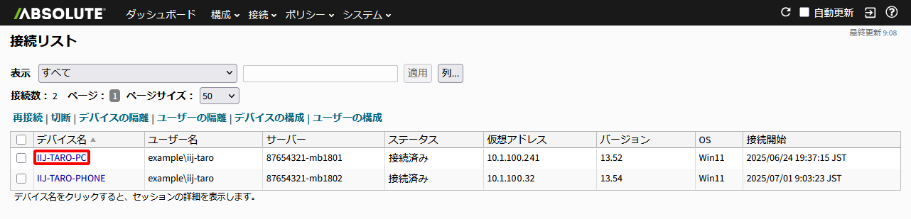 VPN接続しているデバイスの詳細情報を確認します。VPNセッションで使用された資格情報、及びどのようなルールセットが適用されているか確認できます。