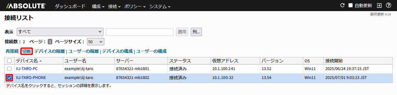 2.強制切断するデバイスにチェックを入れ、「切断」をクリックします。