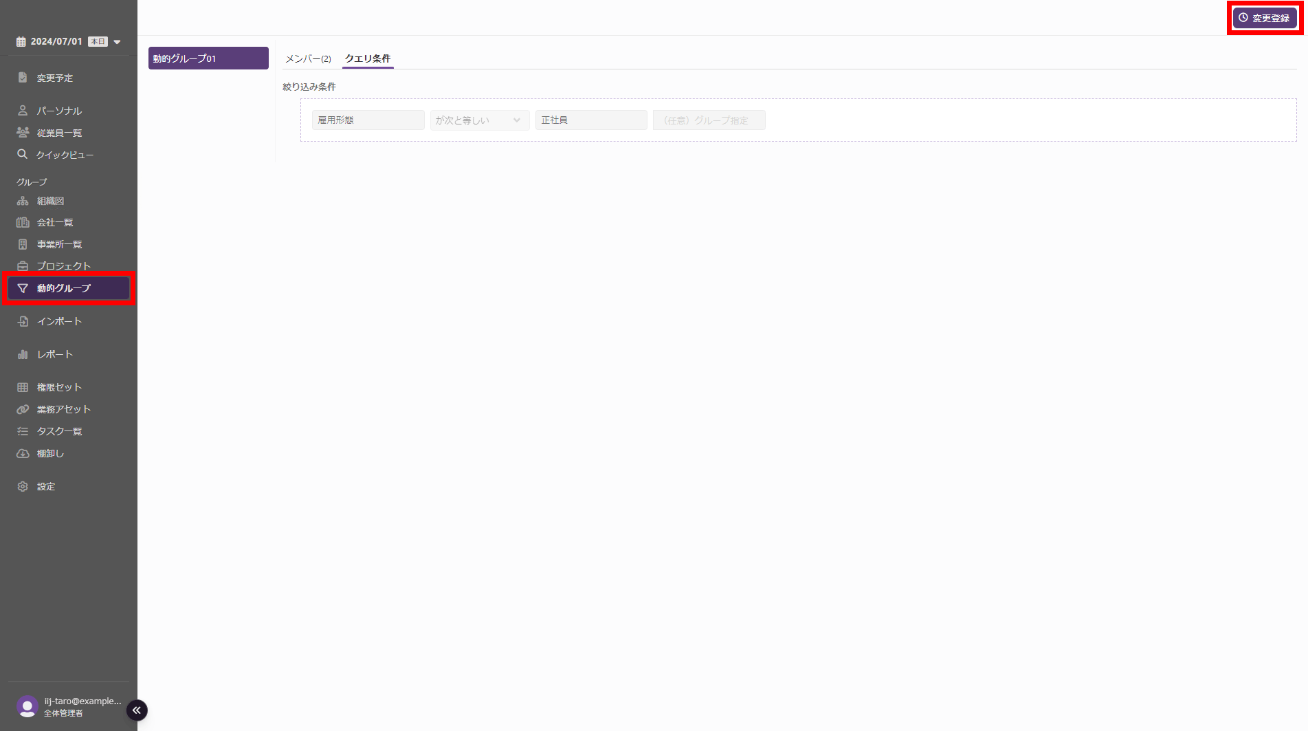 1.「動的グループ」をクリックし、「変更登録」をクリックします。