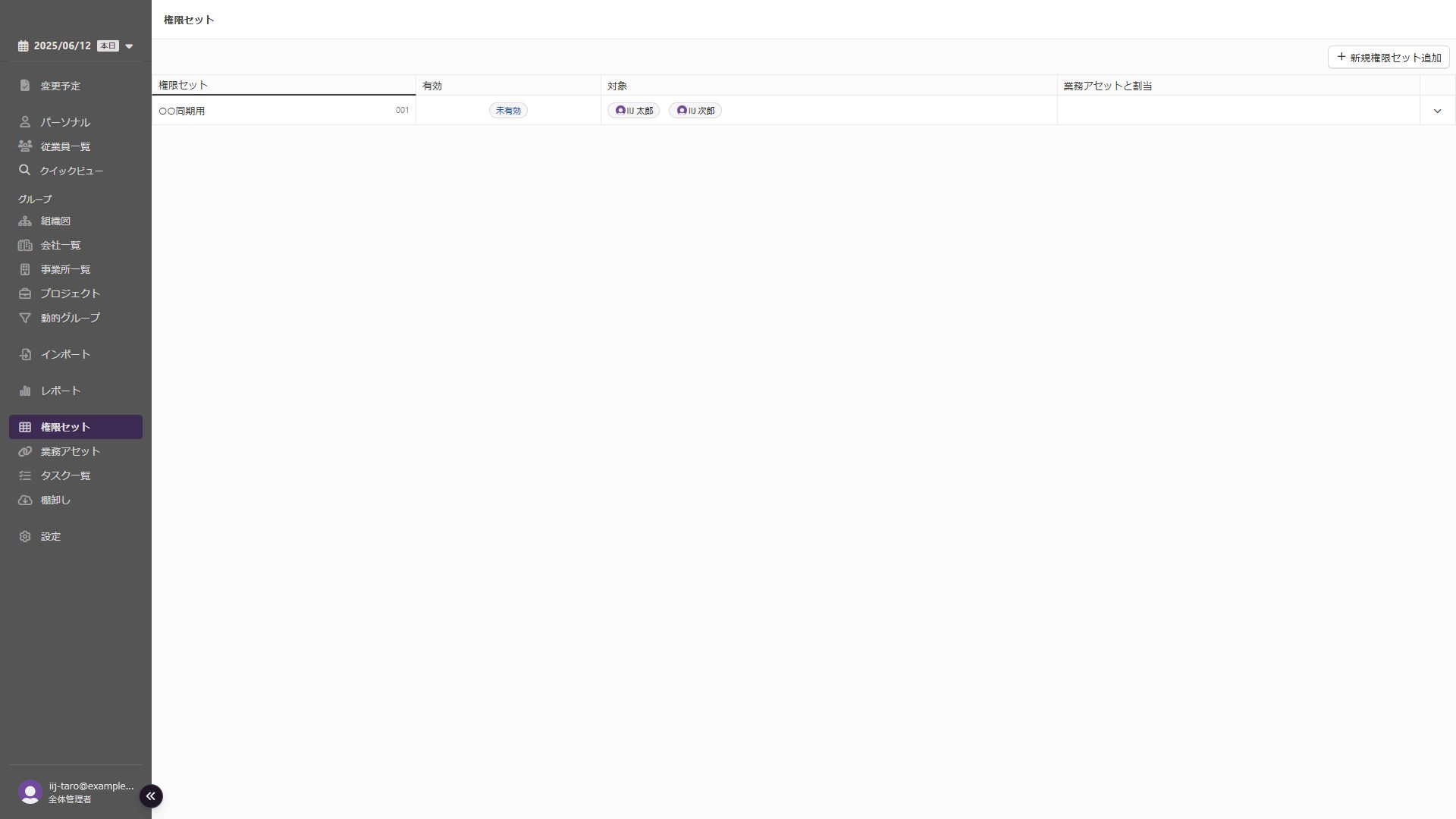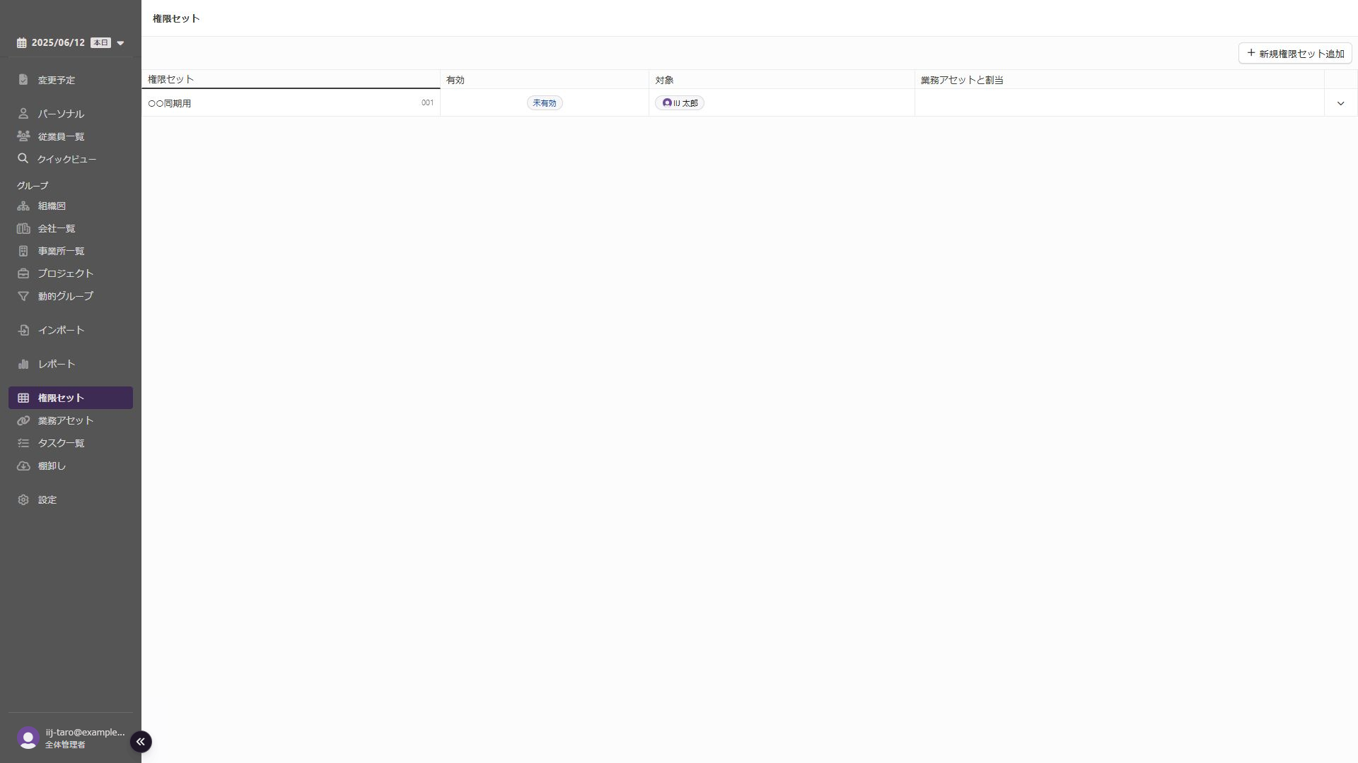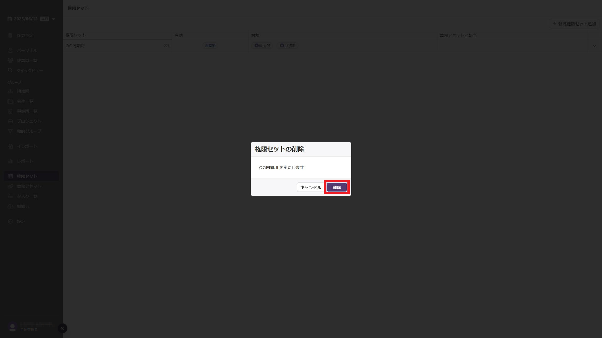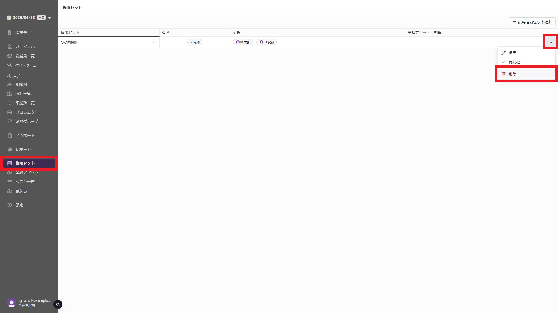 1.「権限セット」をクリックし、削除する権限セット一覧の行にあるプルダウンメニューから「削除」を選択します。