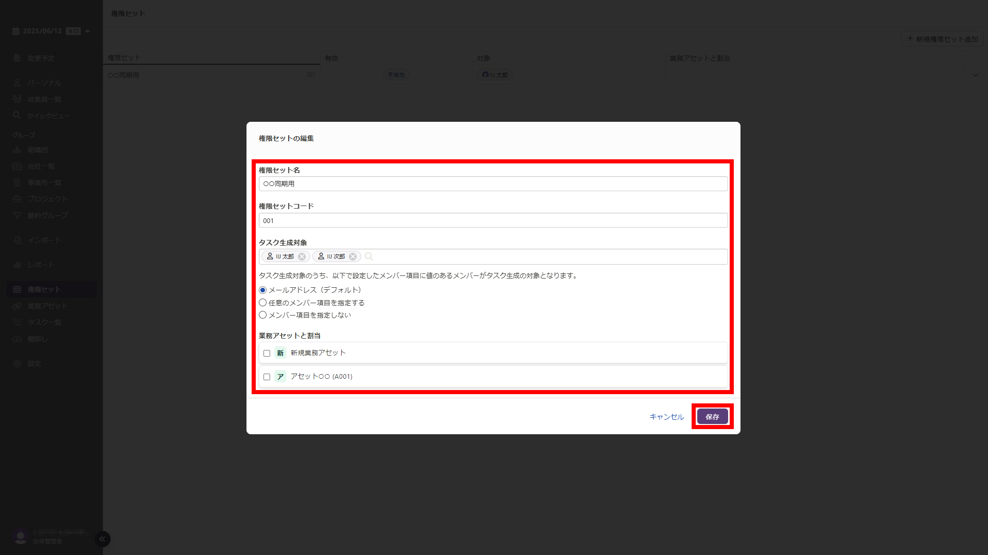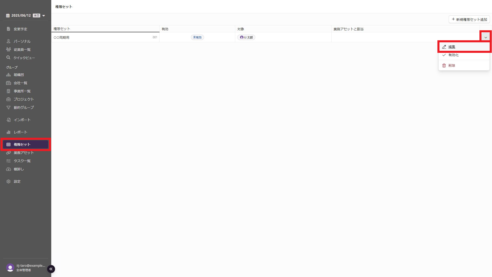 1.「権限セット」をクリックし、登録情報を変更する権限セットの行にあるプルダウンメニューから「編集」を選択します。
