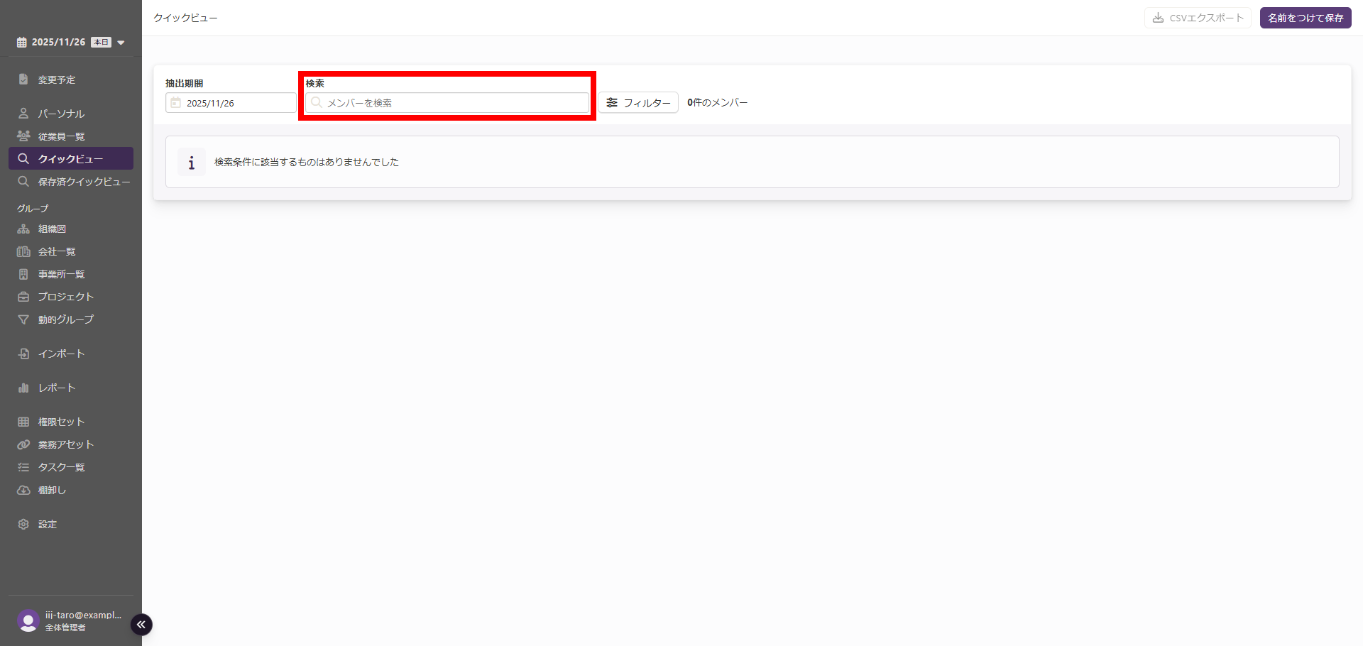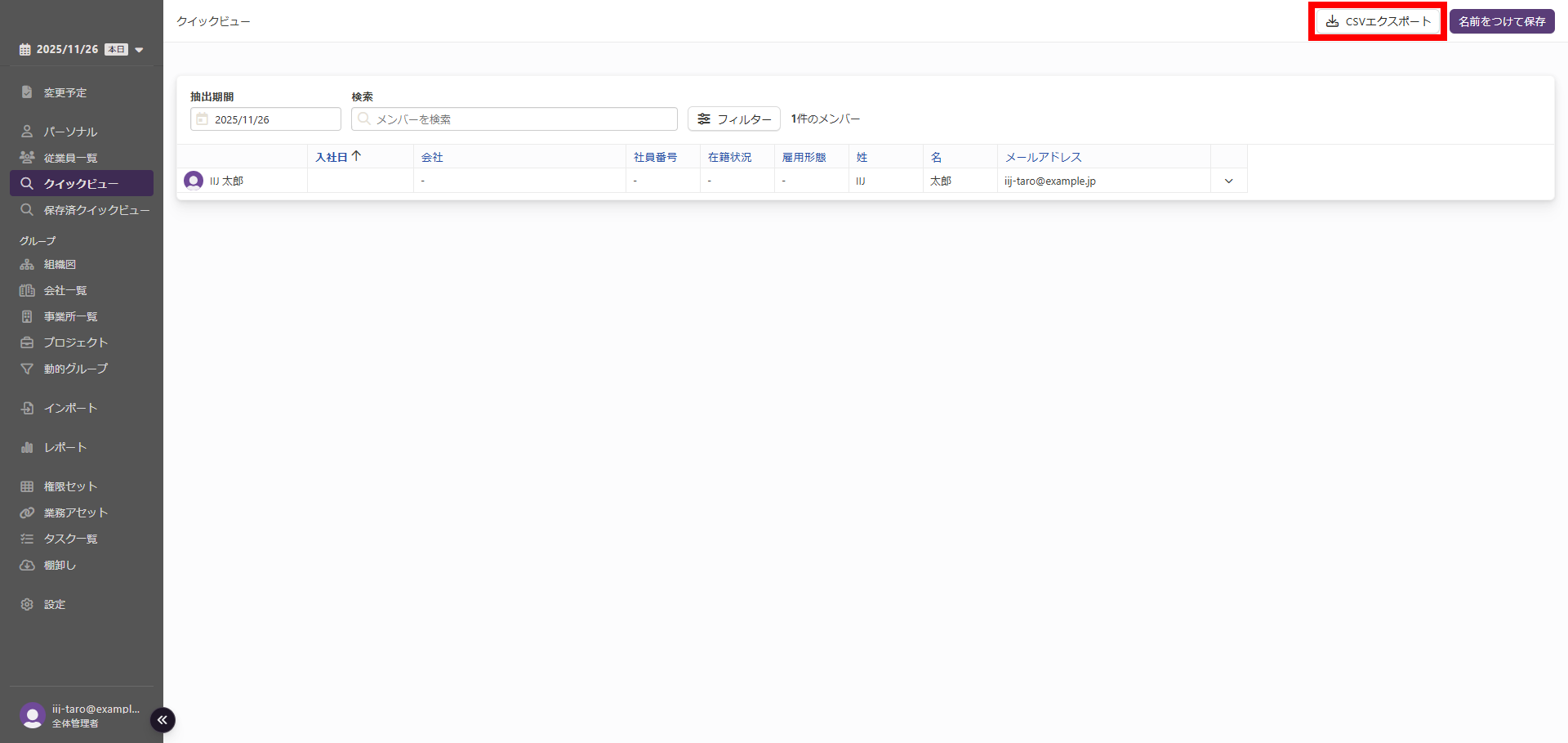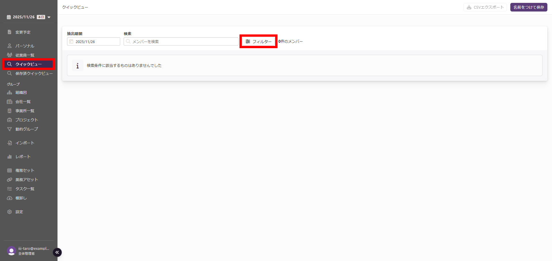 フィルター設定及び従業員検索の結果が反映された「クイックビュー」画面で「エクスポート」を行うと、出力されるCSVファイルにもその内容が反映されます。