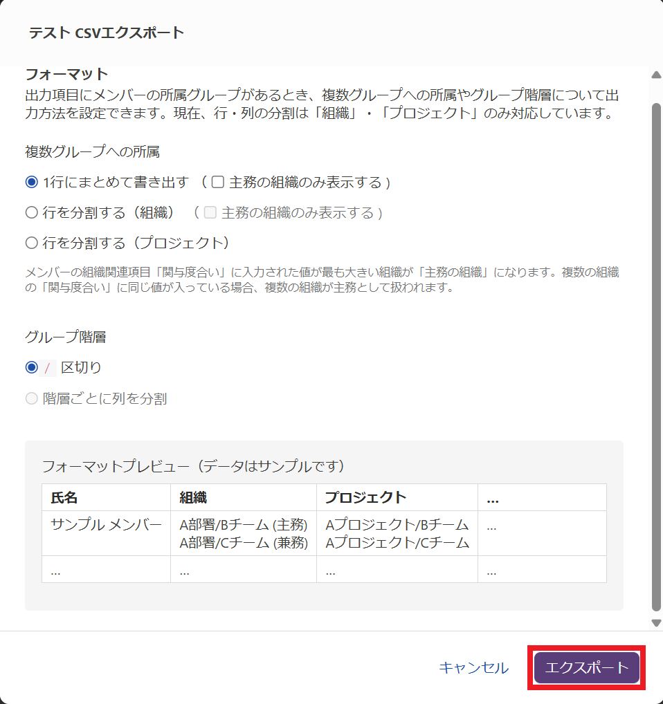 また「フィルター」の「出力項目」に「組織」や「プロジェクト」が選択されている状態で「CSVエクスポート」をクリックすると以下のフォーマットを選択する画面が表示されます。