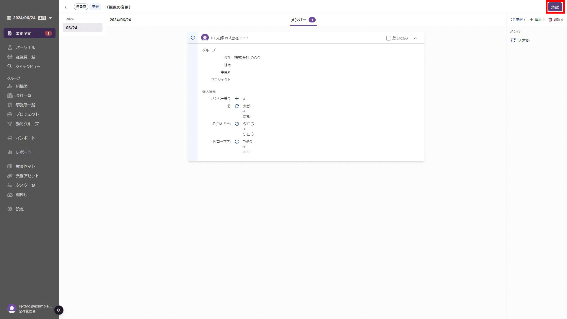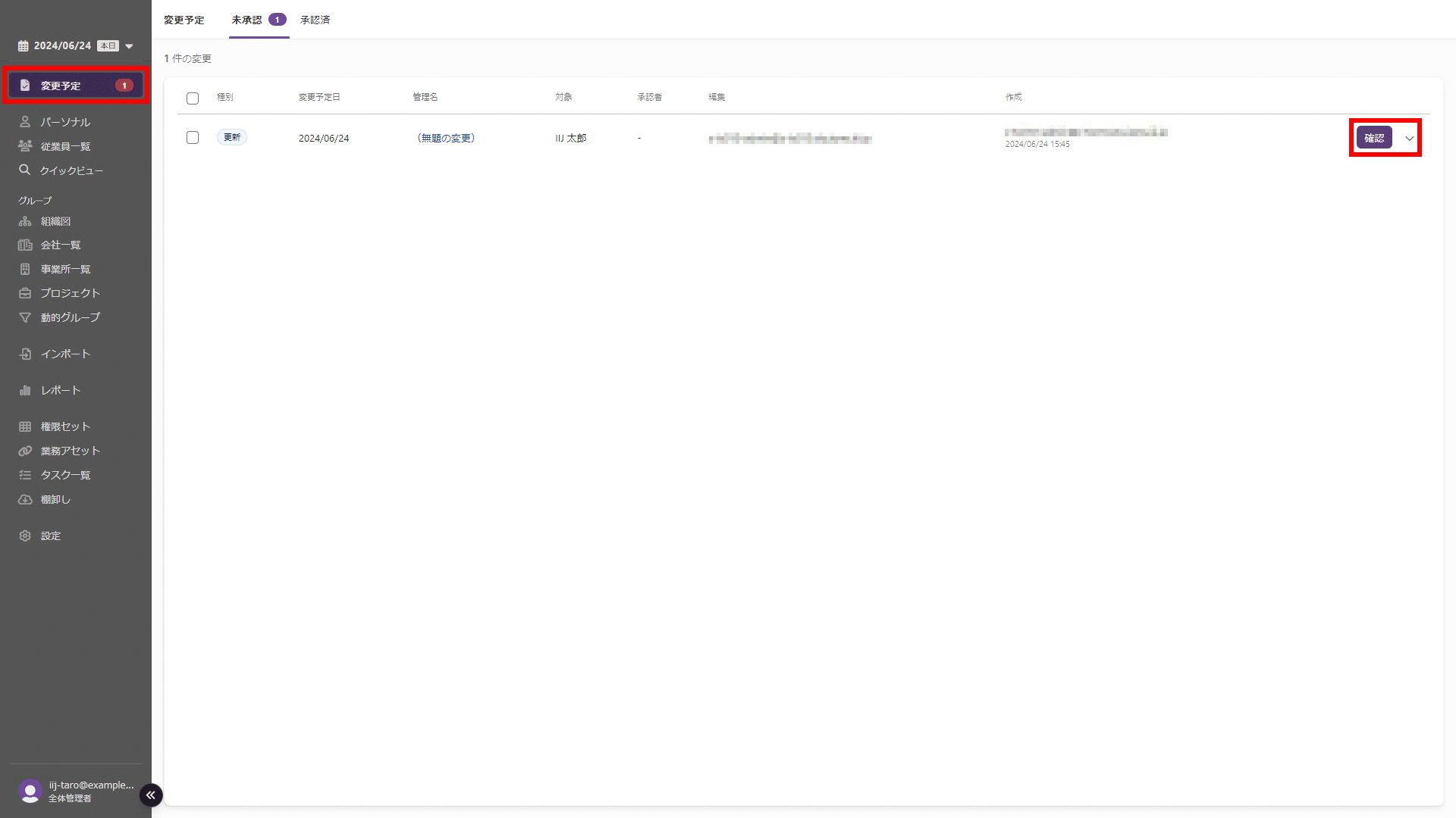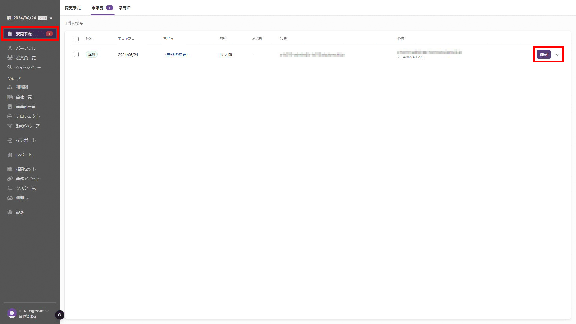 4.「変更予定」をクリックし、登録情報を変更するメンバーの行に表示されている「確認」を選択します。
