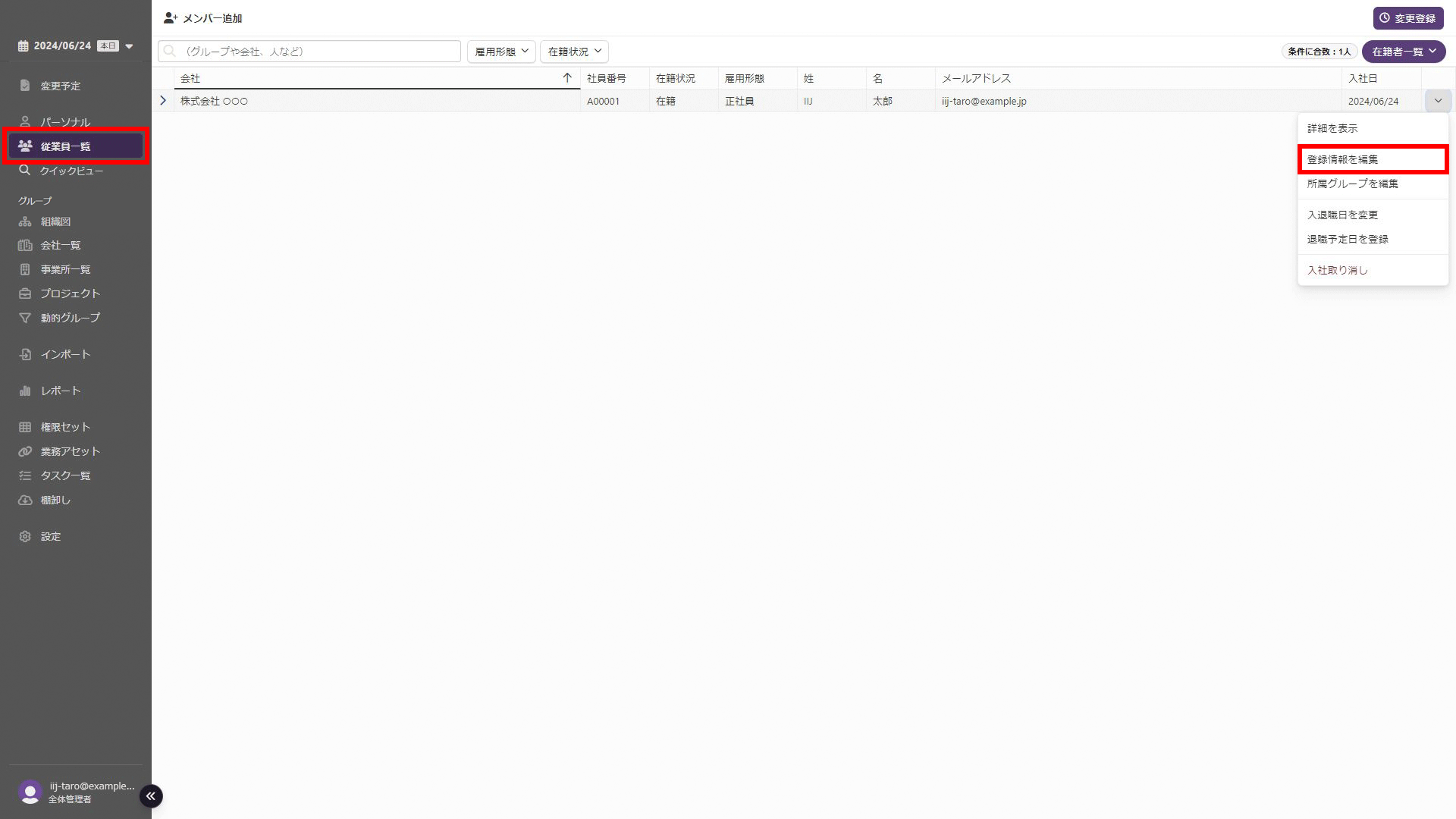 1.「従業員一覧」をクリックし、登録情報を変更するメンバーの行にあるプルダウンメニューから「登録情報を編集」を選択します。