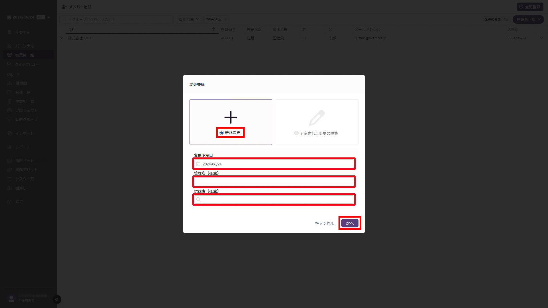 2.「新規変更」を選択の上、以下の項目を設定し、「次へ」をクリックします。